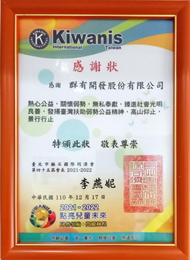 本公司於110年參與點亮兒童未來活動,回饋社會參與公益,榮獲樞石同濟會頒發感謝狀乙幀。